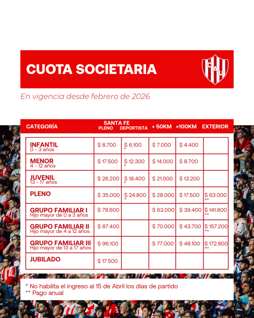 Tal como se venía implementando de manera trimestral , y contemplando el aumento del 33% de las entradas generales (de $ 30.000 a $ 40.000) dispuesto por la Asociación del Fútbol Argentino, la inflación y las actualizaciones de los servicios públicos y de los gastos corrientes de la institución durante los meses de noviembre y diciembre 2025 y enero 2026, el club Unión informó este sábado los nuevos valores de las cuotas societarias desde febrero.