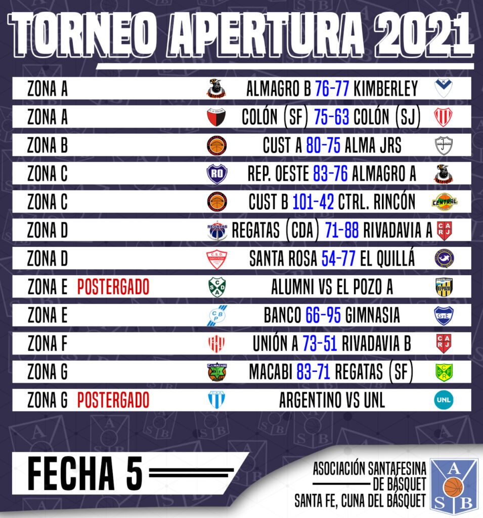 Se jugó gran parte del quinto capítulo del Torneo Apertura 2021 de la Asociación Santafesina de Básquet, al tiempo que quedan dos cotejos postergados: Alumni – El Pozo A y Argentino – UNL.