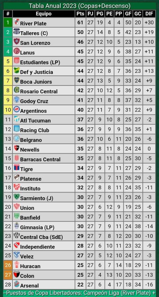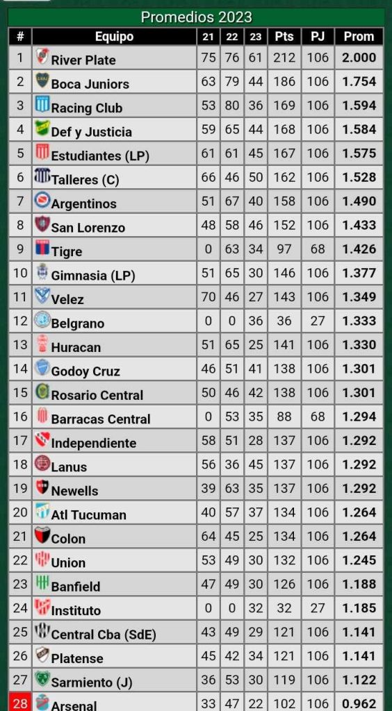 En el último capítulo, Unión derrotó de local a Defensa y Justicia y estiró a 5 puntos la diferencia con Colón, que cayó en Sarandí 2-0 frente a Arsenal y quedó junto a Huracán en zona de descenso. Hoy el Sabalero y el Globo comparten la pen{ultima ubicación con 25 unidades, por lo que tendrían que jugar un desempate, atendiendo que Arsenal, último en la tabla de promedios, pierde la categoría.