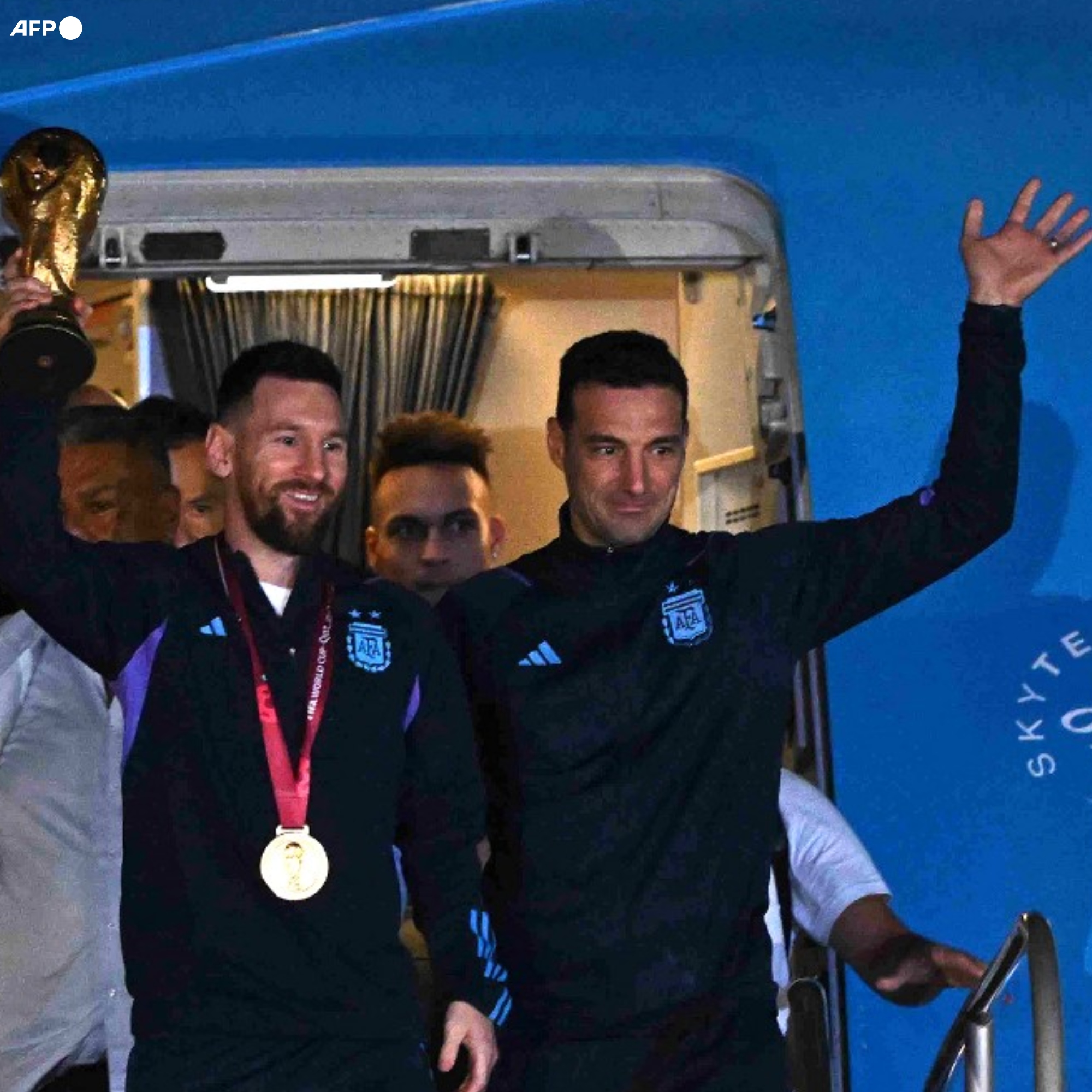 En la primera foto, Messi, junto a Scaloni y Chiqui Tapia, bajó del avión cargando el trofeo. Inmediatamente detrás, el resto de los jugadores y el CT. Sonrisas impagables en medio de la aureola. Directos al vagón de espera, con los protagonistas, con la medalla de oro, cantando.