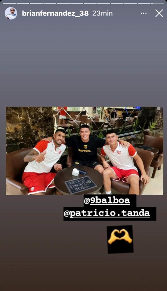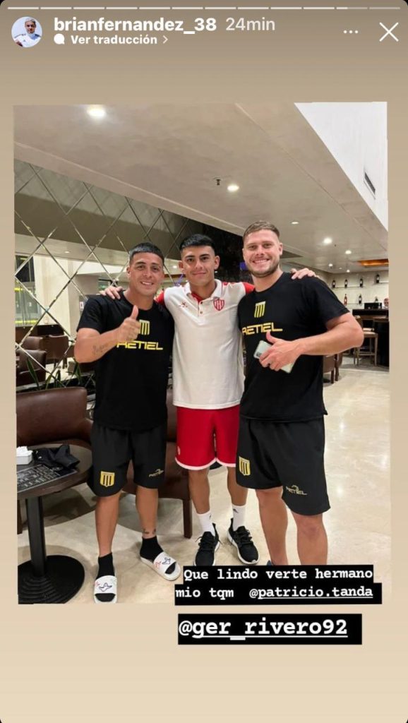 Mediante su cuenta de Instagram, Fernández posteó imágenes con Patricio Tanda, a quien conoce de su paso por Racing. «Qué lindo verte, hermano mío», le escribió al mediocampista Tatengue. Y luego posteó una foto con el propio mediocampista y Adrián Balboa.