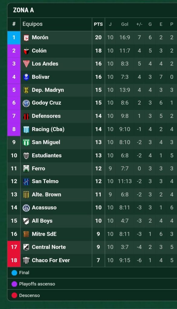 De esta manera, la tabla empieza a marcar un lote de cuatro equipos que se cortan en la parte alta: Morón, Colón, Los Andes y Bolívar, todos con aspiraciones firmes en este arranque de temporada.