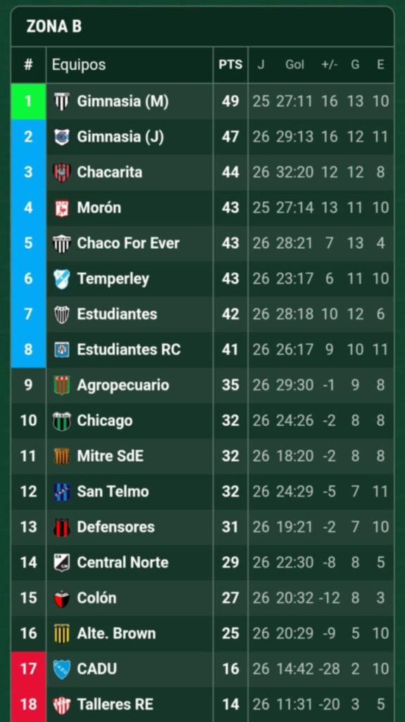 En la tabla de la Zona B, Talleres (RE) y el CADU están seriamente comprometidos, pero como existen equipos como los santafesinos (atención también Almirante Brown, Central Córdoba y Defensores de Belgrano) que pierden seguido en este último tiempo, el final promete adrenalina para determinar quién se va y quien se queda en la divisional.
