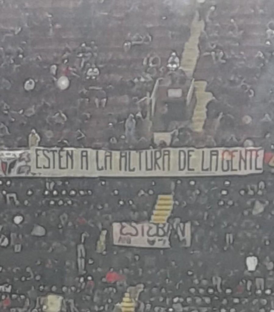 A los 34 el cotejo se detuvo por incidentes en el codo noroeste del estadio, mientras los hinchas gritaban “que se vayan todos”. El árbitro Viola decidió suspenderlo luego de casi 15 minutos de espera.