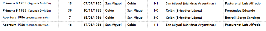 En total, el Sabalero se enfrentó cuatro veces con el equipo albiverde que este martes dejó en el camino a Douglas Haig y aseguró el lugar en la Primera Nacional. En el año 1985 hubo dos enfrentamientos: empate 1 a 1 en Buenos Aires y victoria rojinegra 1 a 0 en Santa Fe. El primero de los encuentros tuvo lugar el 7 de julio de 1985 y los goles fueron marcados por Aldo «Pichón» Rodríguez para Colón y Juan José Acuña para San Miguel. La revancha, en Santa Fe, se jugó el 10 de noviembre del mismo año y el triunfo Sabalero fue sobre el final: a los 90 minutos, Juan Alberto Vera le dio el gol de la victoria al elenco que en ese momento era dirigido por Aníbal Tarabini.