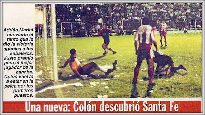 22 de julio de 1995. Adrian «Chupete» Marini marcaría el gol del triunfo de Colón, en Tucumán y ante San Martin para empezar a encaminar el retorno a Primera División, un ascenso que luego conseguiría en el encuentro de vuelta y tras imponerse por 3 a 1 en el Cementerio de los Elefantes.