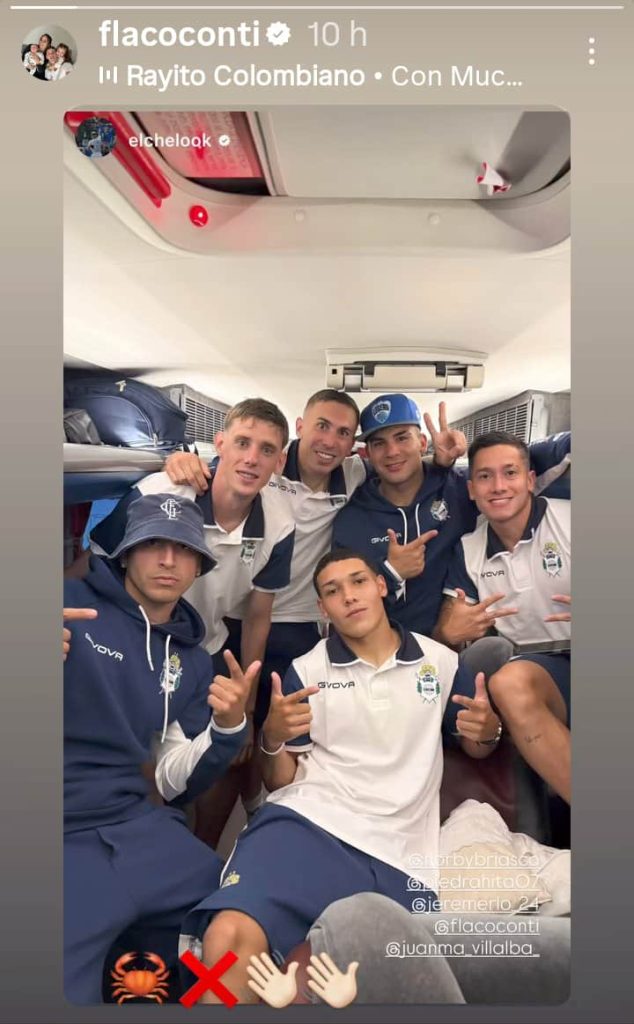 Sin mencionarlo, el defensor, que ingresó en el segundo tiempo, mostró una foto festejando el triunfo con otros futbolistas del Lobo y acompañada con emojis que podrían ser alusivos a Unión…
