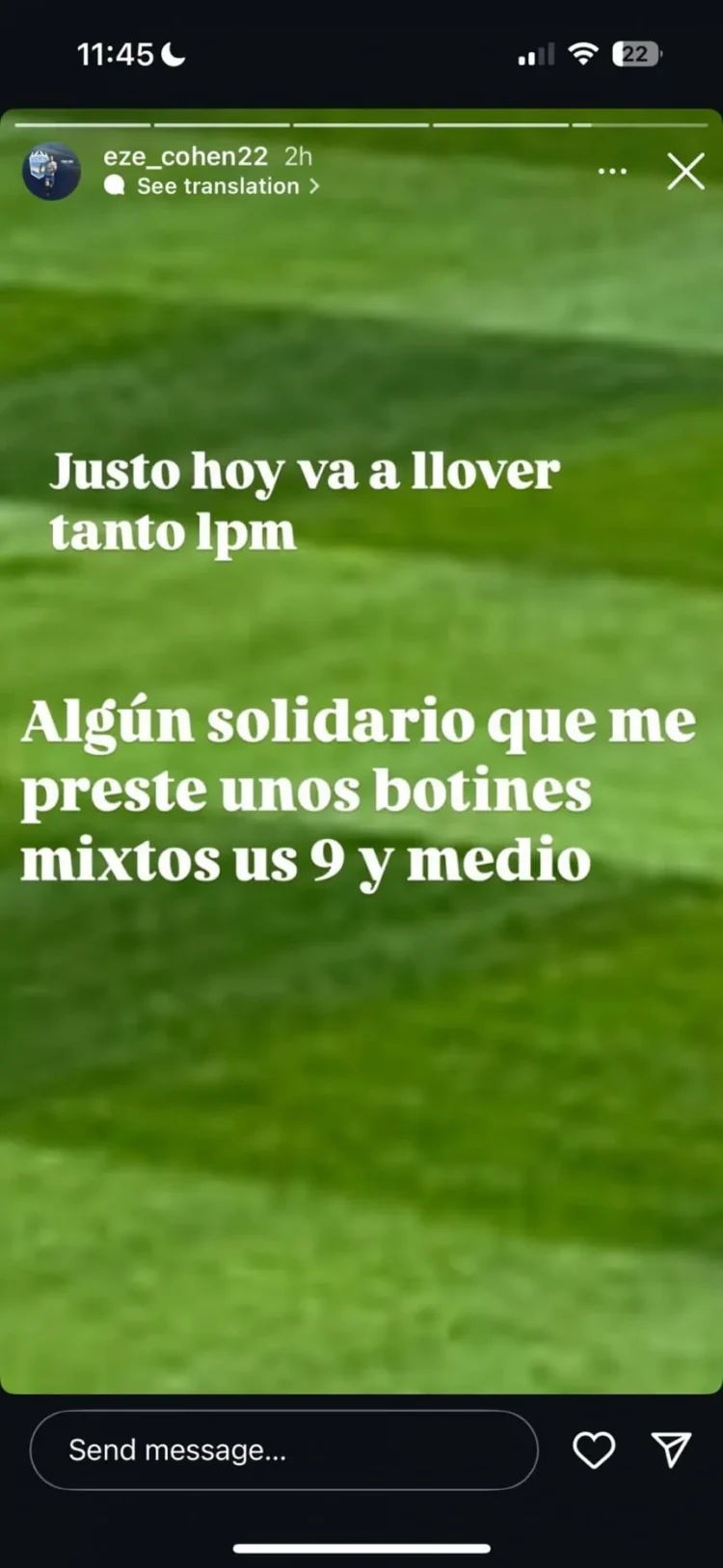 «Justo hoy va a llover tanto lpm. Algún solidario que me preste unos botines uso 9 y medio», escribió el defensor de 31 años en una historia de Instagram durante la mañana previa al partido que finalizó 1 a 0 a favor del Lobo. Esto causó gracia y revuelo en las redes, siendo un hecho insólito. Sin embargo, es un tema muy común entre las divisiones más bajas del fútbol argentino.