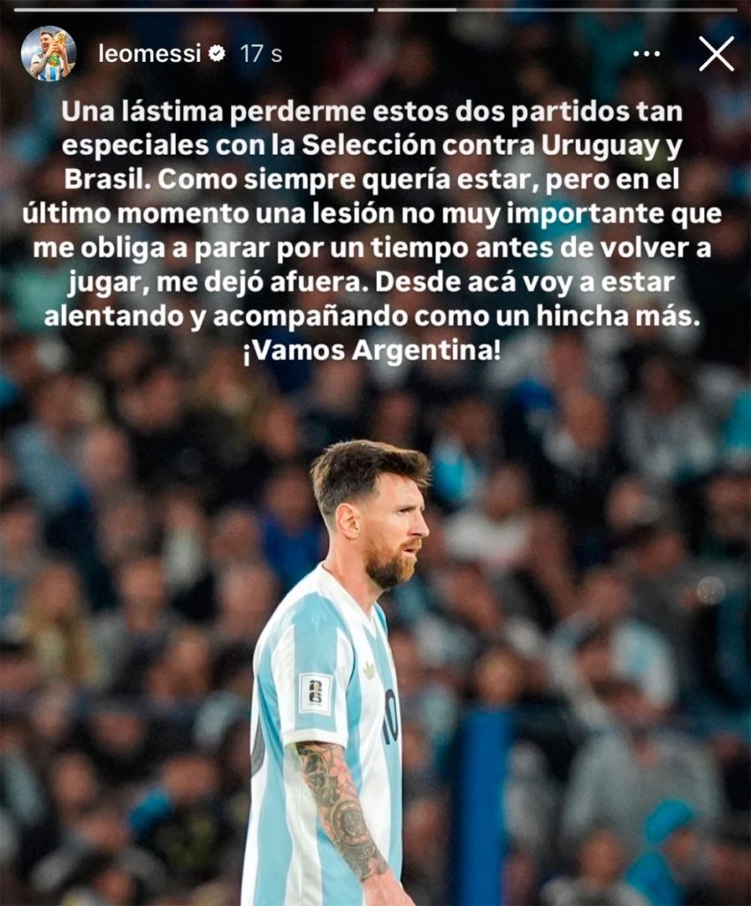 A través de una historia en Instagram, Messi lamentó su ausencia en esta doble fecha, en la que también podría haber disputado su último clásico ante Brasil en Eliminatorias. Además, su histórico rival Neymar tampoco estará presente.