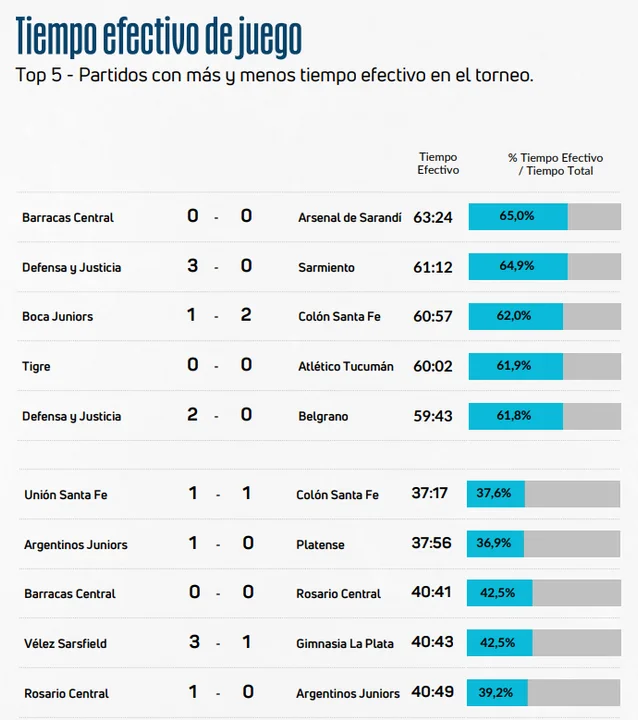 El partido que tuvo más tiempo efectivo fue Barracas-Arsenal (0-0) con 63:24, mientras que el que menos se jugó fue el clásico santafesino entre Unión y Colón con 37:17 SOBRE 90 MINUTOS.