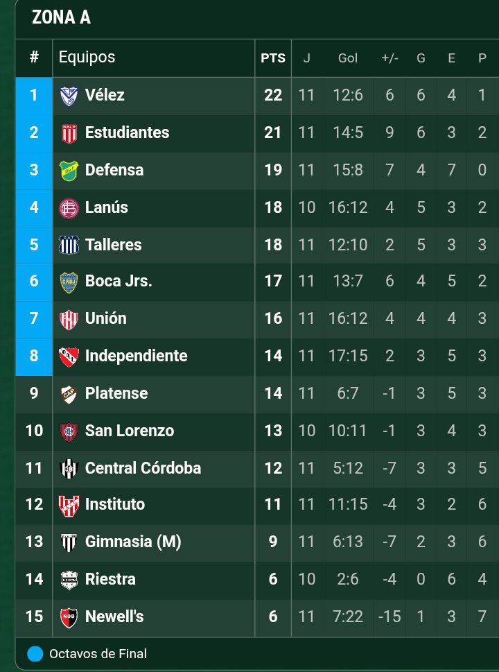 Actualmente, el Tatengue suma 16 puntos y todavía se mantiene entre los ocho mejores, pero con margen mínimo. La diferencia con los que vienen por afuera es corta