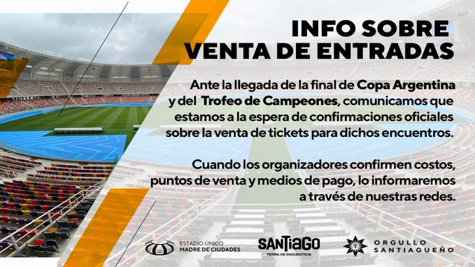 A través de su cuenta de Twitter, el Estadio Madre de Ciudades señaló que se encuentran «a la espera de confirmaciones oficiales sobre la venta de tickets» tanto sobre la final de la Copa Argentina como la del Trofeo de Campeones que se disputarán allí.