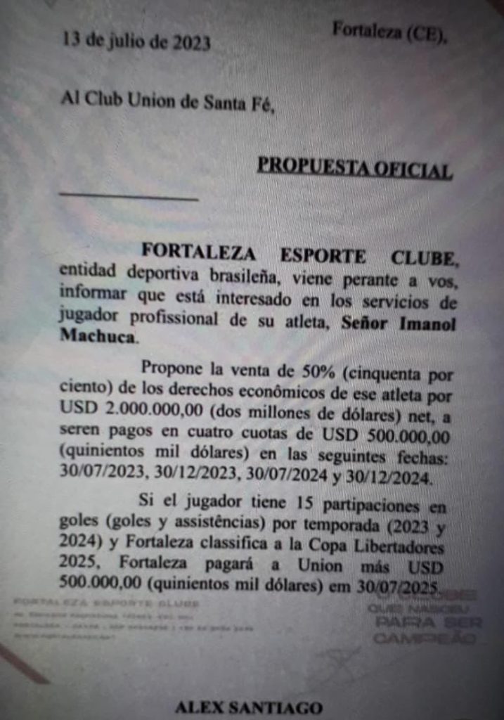 Por otro lado, otro asunto importante en el seno del club es el interés de Fortaleza Esporte Clube de Brasil en el talentoso jugador Imanol Machuca. Las ofertas por el futbolista han estado llegando a las oficinas de López y Planes, y la última propuesta oficial data del 13 de julio. Según el documento, Fortaleza estaría interesado en adquirir el 50% de los derechos económicos de Machuca por una suma de USD 2.000.000. El pago se realizaría en cuatro cuotas de USD 500.000, programadas para fechas específicas: 30/7/2023, 30/12/2023 y 30/12/2024. Sin embargo, el acuerdo también incluye incentivos adicionales.