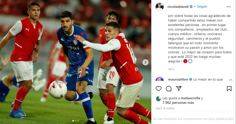 Al cerrar la temporada, el atacante fue uno de los jugadores que de antemano se sabía que no seguiría en el Tate. En sus redes sociales, el propio Blandi tuvo una sentida despedida de la entidad rojiblanca. «Gracias Tate ! Me voy contento de haber conocido desde adentro al “Dueño de la Ciudad “ , de que se hayan cumplido los objetivos y por sobre todas las cosas agradecido de haber compartido estos meses con excelentes personas , en primer lugar mis compañeros , empleados del club , cuerpo médico , utileros, cocineros , seguridad , cancheros y el pueblo tatengue que en todo momento mostraron su pasión y amor por los colores . Lo mejor de corazón para todos y que esté 2022 les traiga muchas alegrías!», escribió en su instagram.