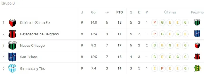 Colón acumula 18 puntos con una diferencia de gol positiva de 6. Defensores de Belgrano, por su parte, está segundo, acumula 17 puntos y tiene una diferencia de goles de +9. Mientras que San Telmo cuenta con 15 unidades en el cuarto puesto, y su diferencia de gol es de +7.