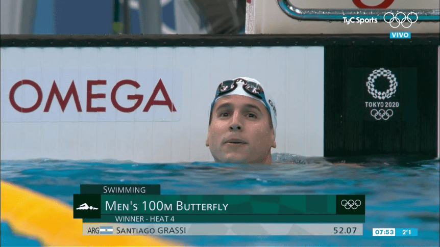El nadador argentino Santiago Grassi tuvo una gran presentación en los Juegos Olímpicos Tokio 2020 ya que culminó primero en su serie de 100 metros mariposa con un tiempo de 52.07 segundos, pero pese a eso no pudo meterse en las semifinales y terminó en el puesto 24° de la general.