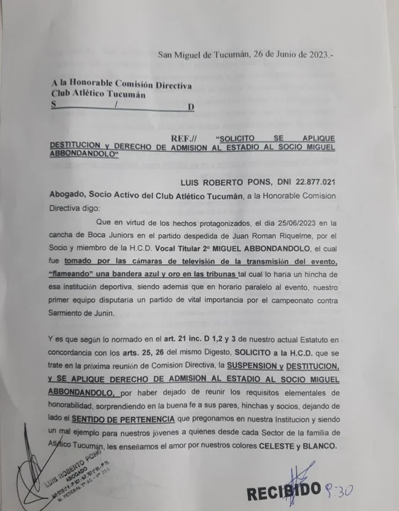 «Que en virtud de los hechos protagonizados, el día 25/06/2023 en la cancha de Boca Juniors en el partido despedida de Juan Román Riquelme, por el Socio y miembro de la H.C.D. Vocal Titular 2° MIGUEL ABBONDANDOLO, el cual fue tomado por las cámaras de televisión de la transmisión del evento «flameando» una bandera azul y oro en las tribunas tal cual lo haría un hincha de esa institución deportiva, siendo además que en horario paralelo al evento, nuestro primer equipo disputaría un partido de vital importancia por el campeonato contra Sarmiento de Junín», reza el pedido formal Luis Roberto Pons, socio Activo del Club Atlético Tucumán.