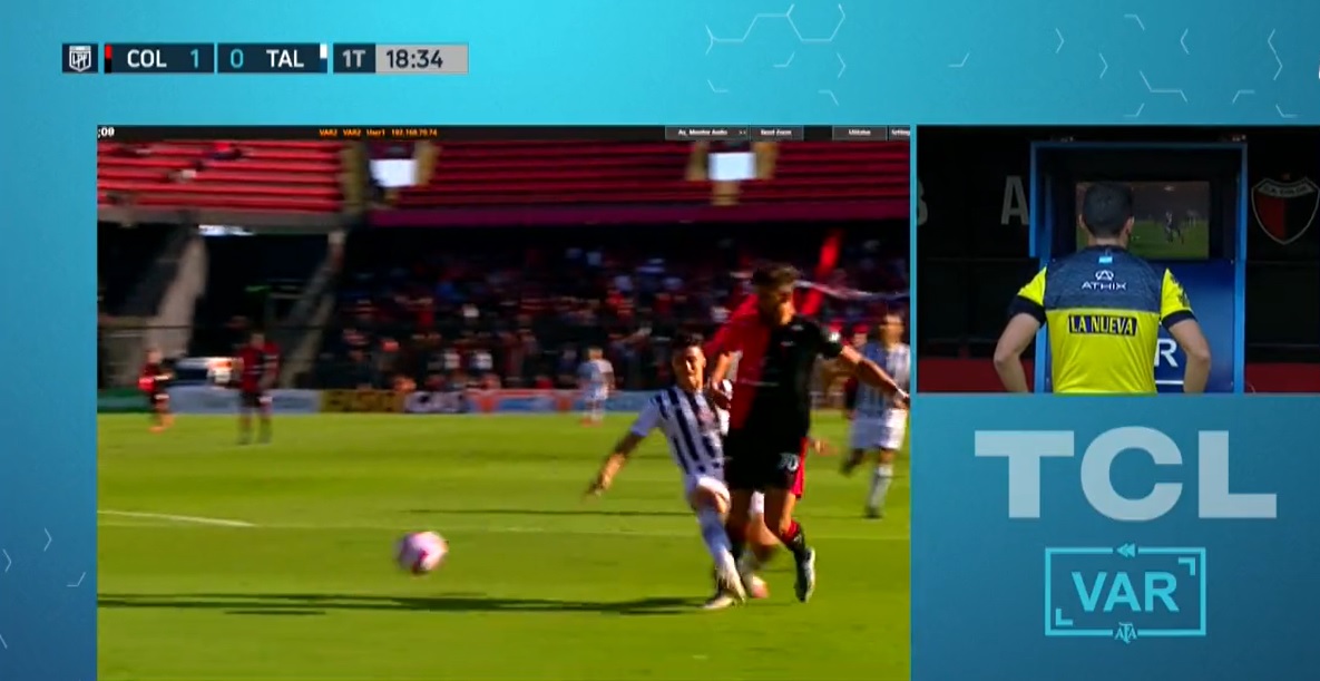 Cuando transcurría la etapa inicial, y Colón se imponía por 1-0, Lucas Suárez cruzó a Santiago Pierotti dentro del área. El VAR solicitó que el árbitro principal, Ramírez, tome la decisión final. El juez dispuso no sancionar penal.