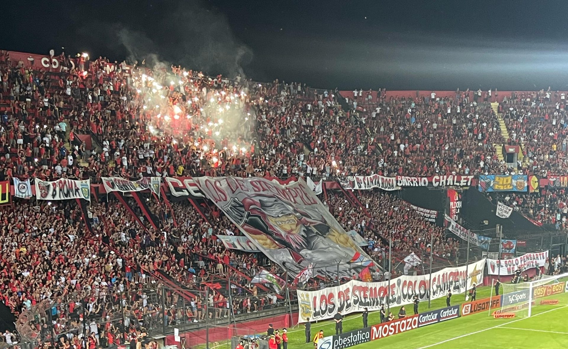 Tanto en la previa como durante el encuentro ante Nueva Chicago, la parcialidad de Colón utilizó bengalas y explosivos dentro del perímetro del Brigadier López. Algo de lo exhibido fue autorizado por la Dirección de Explosivos, pero otra parte no cumplían con los requisitos, con lo cual el Sabalero podría ser sancionado.
