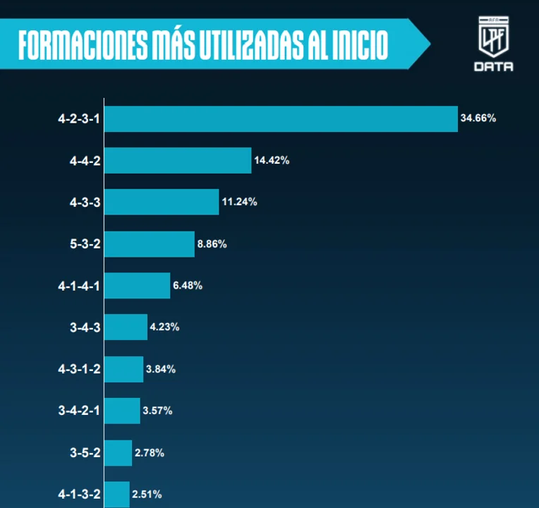 Al mismo tiempo, las confrontaciones tácticas más vistas fueron la del 4-2-3-1 vs. 4-2-3-1 (100 veces), 4-2-3-1 vs. 4-4-2 (37) y 4-2-3-1 vs. 4-3-3 (33).