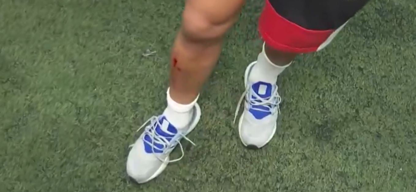 Así le quedó la pierna a Santiago Hidalgo luego del patadón de Nicolás Paz, que le valió la expulsión al jugador de Unión.