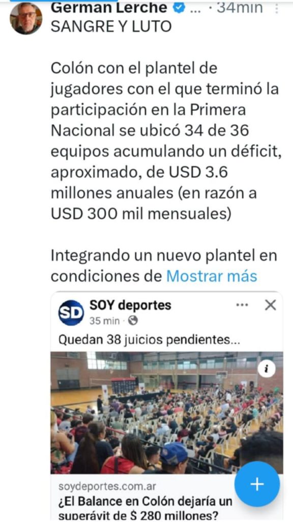 El ex presidente de Colón, Germán Lerche, utiliza sus redes sociales para expresar su opinión y visivilizar algunas cuestiones intestinas, desde su experiencia, ante situaciones extremas que vive por estas horas la entidad del barrio Centenario.