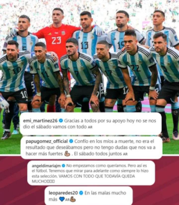 Tras la sorpresiva derrota de la Selección Argentina 2-1 ante Arabia Saudita en su debut en el Mundial de Qatar 2022, los jugadores de la Albiceleste se expresaron en las redes sociales y compartieron mensajes esperanzadores con el objetivo de dar vuelta la página rápidamente.