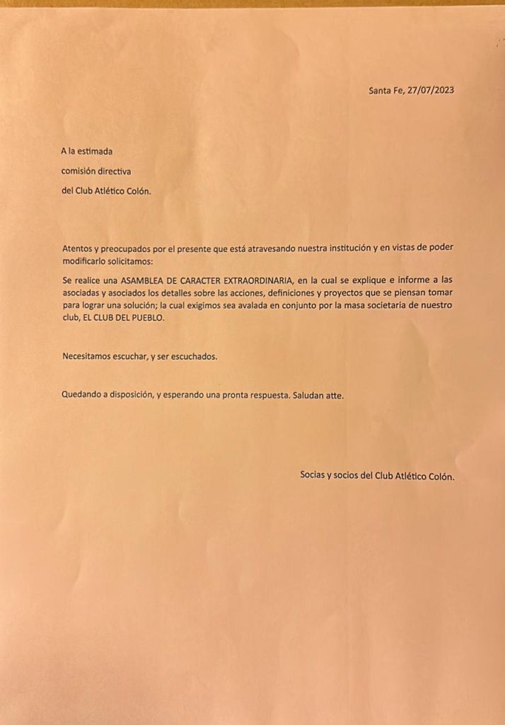 «Que se realice una Asamblea extraordinaria, en la que se explique e informe a los asociados el detalle de las acciones, definiciones y proyectos a tomar para lograr una solución; la cual exigimos sea refrendada en forma conjunta por la masa de socios de nuestro club, el Club del Pueblo». Necesitamos escuchar y ser escuchados. Quedamos a su disposición, y esperamos una pronta respuesta. Atentamente».