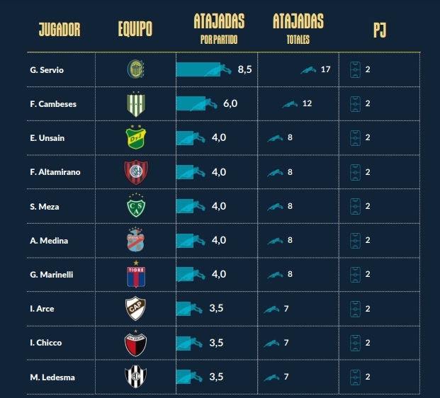 El de mayor cantidad de intervenciones positivas es Gaspar Servio de Rosario Central, con 17 tapadas en dos cotejos, lo que da un promedio de 8,5, seguido por Cambeses de Banfield con 12 (promedio 6).