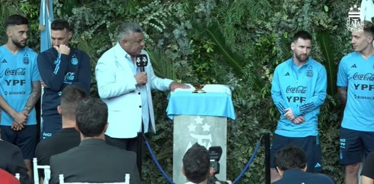 Después de la presentación de Tapia, Messi tomó el micrófono y frente a todos sus compañeros de la Selección y otros referentes del fútbol argentino que fueron invitados al acto (estuvieron Mariano Andújar, Sergio Romero y Marcos Rojo, entre otros) agradeció con mucha emoción por el reconocimiento.