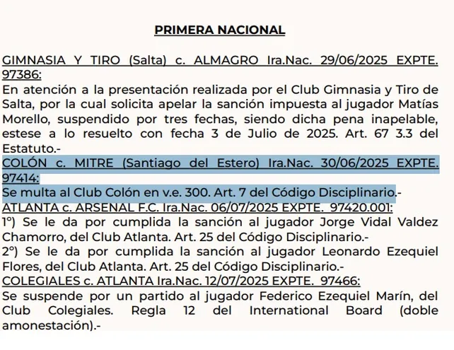 El club Colón fue multado por el Tribunal de Disciplina de AFA con el valor de 300 entradas generales por los incidentes en el partido ante Mitre de Santiago del Estero.