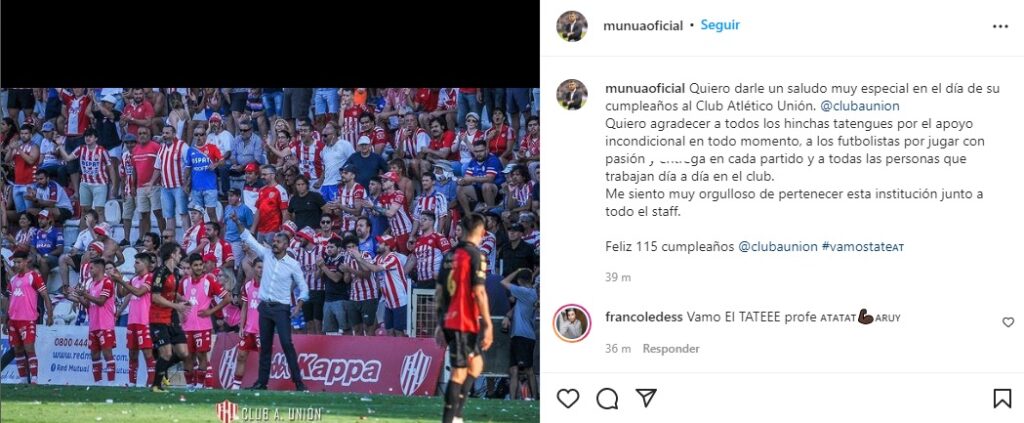 El entrenador de Unión, Gustavo Munúa, saludó al club a través de sus redes sociales. «Me siento muy orgulloso de pertenecer esta institución junto a todo el staff», transmitió el uruguayo.
