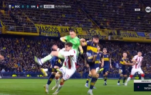 «FASCENDINI cabeceó el balón, MARCHESIN marró el puñetazo y con su cuerpo se lo llevó puesto al hombre de UNION .ARASA no ve nada y en el VAR a CARRERAS justo le tocaron el hombro y se dio vuelta y no vio tampoco .PENAL no sancionado.