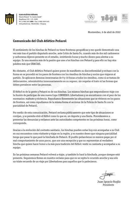 La dirigencia de Peñarol emitió hoy un comunicado oficial luego de su paso por nuestra ciudad en cumplimiento de la 1ra fecha de Copa Libertadores, manifestando su disconformidad y rechazo por lo ocurrido en los pasos fronterizos, con demoras de 9 a 10 horas y repudiaron el accionar de la Policía de la Provincia de Santa Fe.