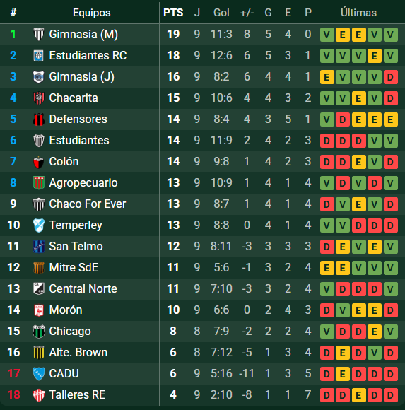 Luego aparece Chacarita con 15, Gimnasia de Jujuy con 16, Estudiantes de Río Cuarto con 18 y el mencionado líder Gimnasia, con 19.