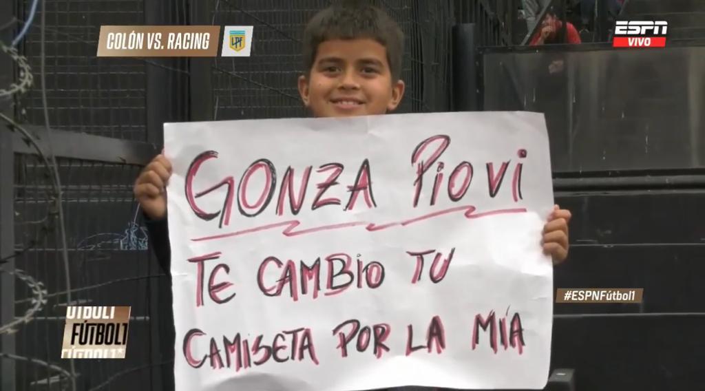 Tal es así que, en el duelo entre Colón y Racing, un niño presentó su pancarta con un mensaje para Gonzalo Piovi. «Te cambio tu camiseta por la mía», rezaba el cartel.