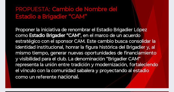 Rodolfo: El tema de namimg en el estadio es inexorable; solo son importantes 2 cosas: la 1ra. los U$ que ingresan y x cuánto tiempo es el contrato. Y la 2da. cómo pones el nombre; no es lo mismo «Estadio Brigadier CAM» que poner «Estadio CAM Brigadier Gral. Estanislao López»
