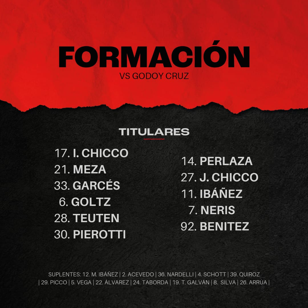 Godoy Cruz: Diego Rodríguez; Pier Barrios, Gianluca Ferrari y Federico Rasmussen; Juan Andrada, Gonzalo Abrego y Thomás Galdames; Matías Ramírez; Roberto Fernández, Tadeo Allende y Tomás Conechny. DT: Diego Flores.