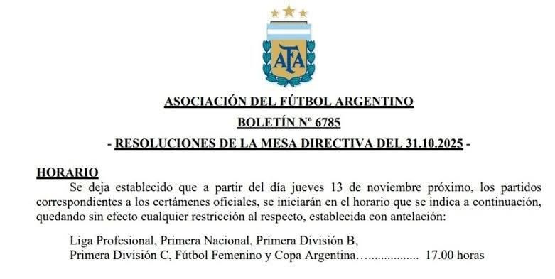 A partir del próximo fin de semana los encuentros oficiales de todas las categorías de la AFA comenzarán a jugarse a partir de las 17.
