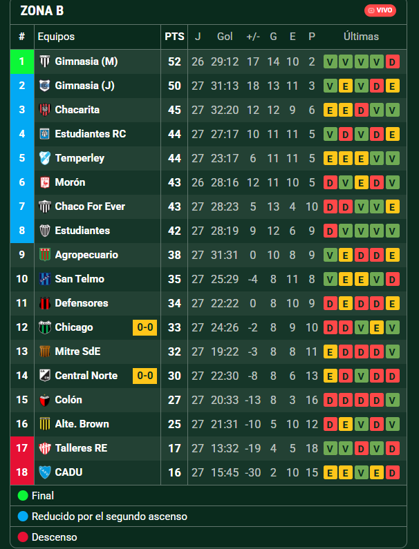 Así, Talleres de Remedios de Escalada, con 17 unidades, y CADU, con 16, son los equipos que estarían descendiendo en la Zona B de la Primera Nacional. Luego aparece Almirante Brown, con 25, y Colón con 27.