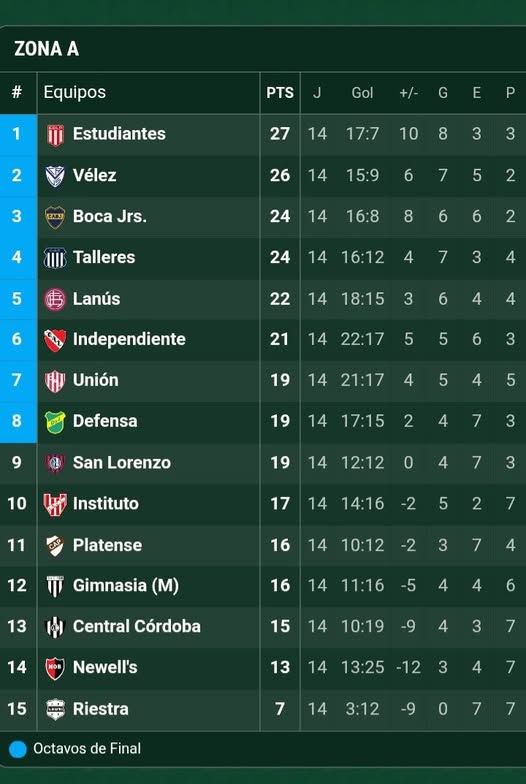 Detrás, la pelea sigue abierta. Instituto de Córdoba aparece 10° con 17 puntos, mientras que Platense suma 16 unidades en el 11° lugar. Más atrás, con el mismo puntaje pero peor diferencia, se ubica Gimnasia y Esgrima de Mendoza, y en el 13° puesto cierra el grupo Central Córdoba de Santiago del Estero con 15.