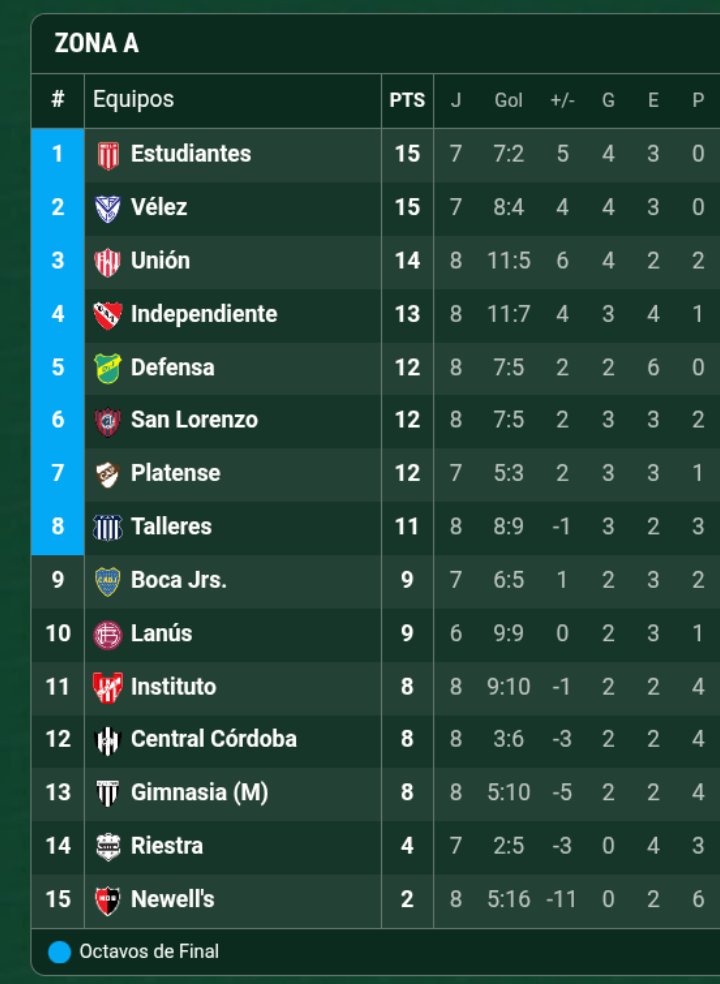 En la Zona A los líderes son Estudiantes de La Plata y Vélez Sarsfield, ambos con 15 puntos. Detrás aparece Unión de Santa Fe con 14 unidades, mientras que Independiente suma 13. Un escalón más abajo se ubican San Lorenzo y Platense con 12 puntos, en tanto que Defensa y Justicia y Talleres reúnen 11. Más atrás figuran Boca Juniors con 9; Lanús, Instituto y Central Córdoba con 8 unidades.