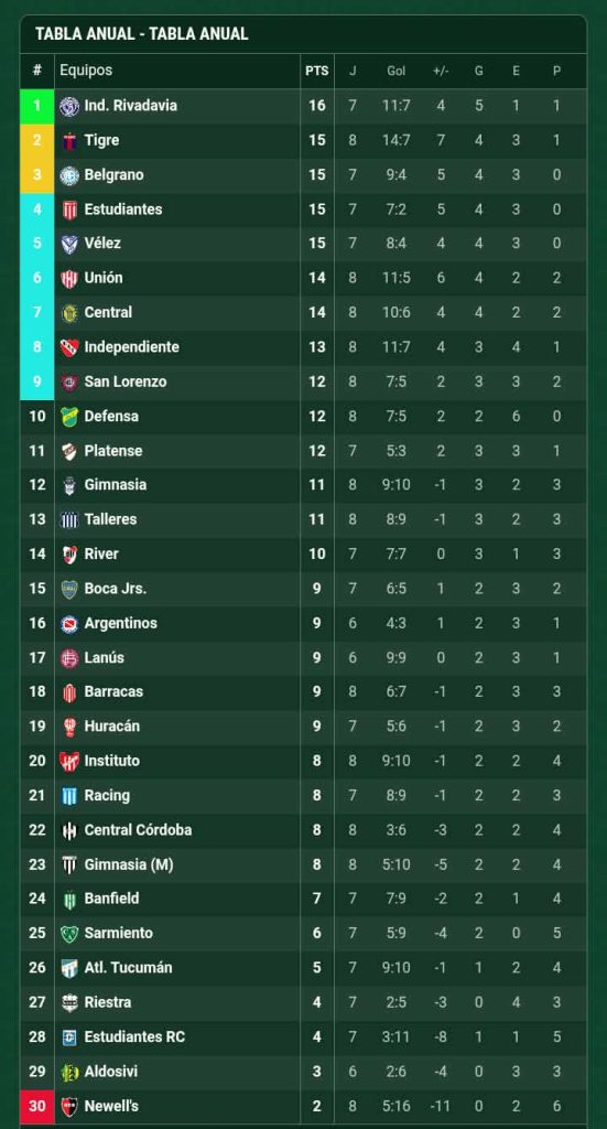 En la Tabla Anual acumulada del año, que definirá las clasificaciones a las copas internacionales 2027, se mantienen en los primeros lugares los equipos que protagonizan sus zonas: Estudiantes, Vélez, Independiente Rivadavia, Tigre, Belgrano y Unión aparecen en la parte alta tras ocho fechas disputadas.