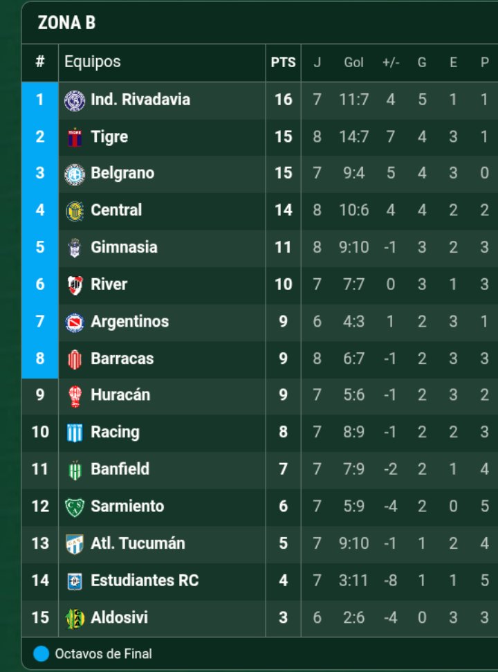 En la Zona B el puntero es Independiente Rivadavia con 16 puntos. Lo siguen Tigre y Belgrano con 15, mientras que Rosario Central acumula 14. Luego aparecen River Plate y Gimnasia La Plata en la zona media, con una campaña irregular en este arranque. Más abajo se ubican Argentinos Juniors, Barracas Central, Huracán y Racing Club, todos dentro de un margen estrecho de puntos que mantiene abierta la pelea por los puestos de clasificación.