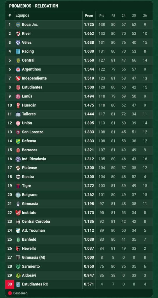 En la tabla de Promedios —que contempla las últimas temporadas para determinar el descenso— los equipos grandes se mantienen con coeficientes altos, mientras que en la zona baja comienzan a comprometerse conjuntos que no han logrado regularidad en los últimos campeonatos. Allí la lucha por la permanencia recién empieza a tomar forma, aunque todavía queda un largo recorrido por delante.