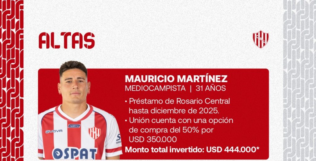 El contrato de préstamo de Mauricio Martínez con Unión expira en este mes de diciembre de 2025 (ver foto), y su continuidad es incierta ya que su ficha pertenece a Rosario Central.