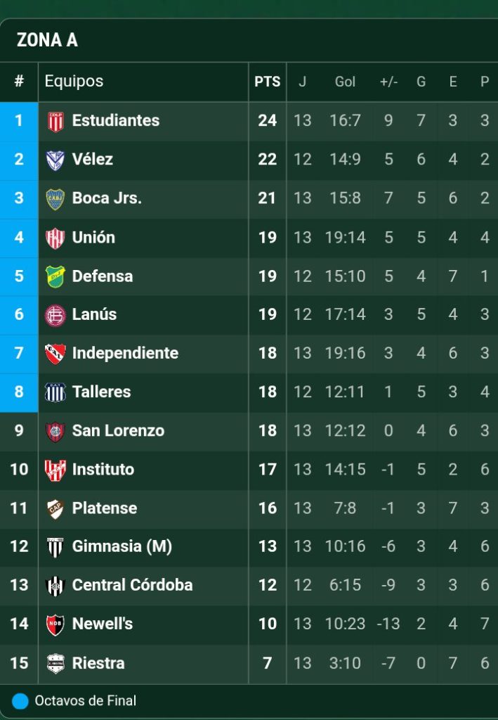 Con varios equipos aún con partidos en disputa, las posiciones muestran un escenario ajustado en la parte alta: Estudiantes de La Plata lidera con 24 puntos (ya jugó). Vélez Sarsfield suma 22 y este lunes será local de Central Córdoba de Santiago del Estero. Boca Juniors aparece con 21 unidades.