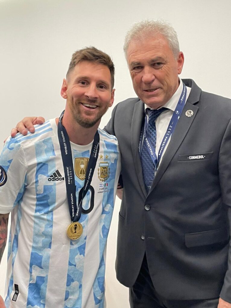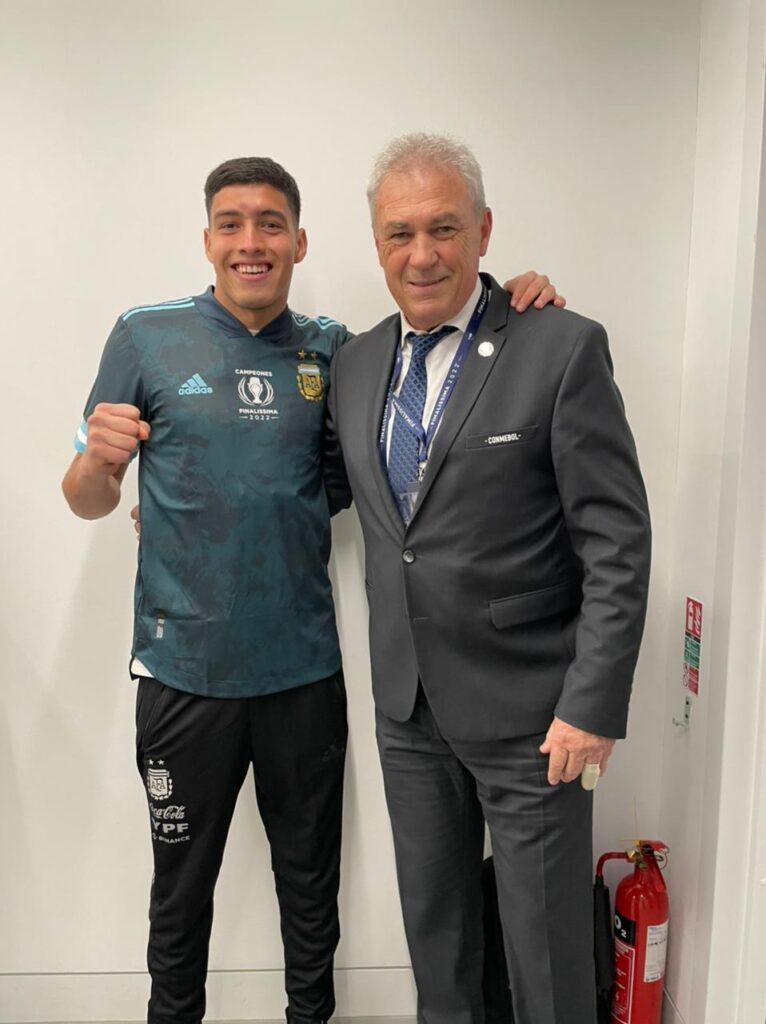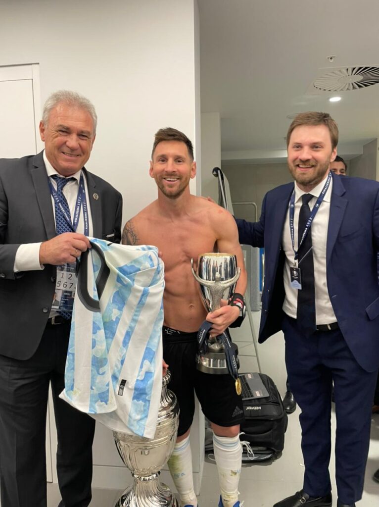Nery Pumpido, Secretario Adjunto de Conmebol, y Diego González, arquero de Unión que oficia como sparring, participaron de las celebraciones de la Selección Argentina tras el 3-0 ante Italia.