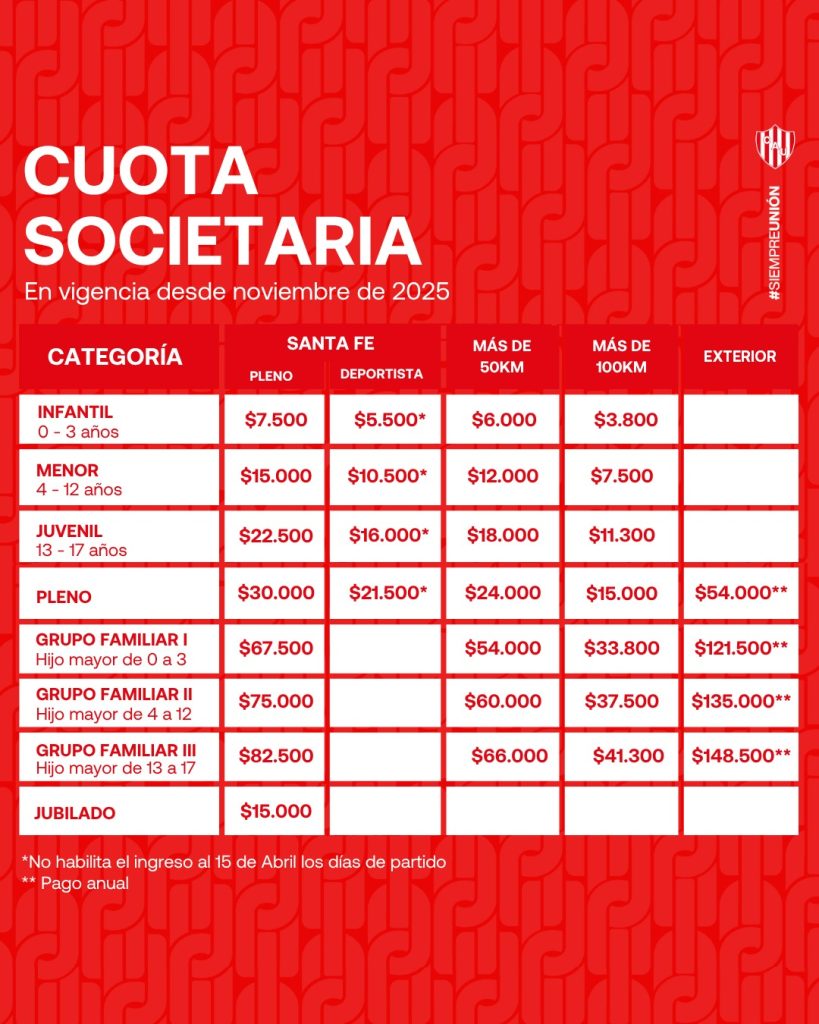 Unión informó los valores societarios de noviembre según las categorías Santa Fe pleno y de deportistas, ubicados a más de 50 kilómetros y a más de 100 kilómetros, los aranceles para infantiles (0 a 3 años) fueron $7.500, $5.500, $6.000 y $3.800; menores (4 a 12 años) en $15.000, $10.500, $12.000 y $7.500; juveniles (13 a 17 años), en $22.500, $16.000, $18.000 y $11.300; plenos $30.000, $21.500, $24.000 y $15.000 y jubilados en Santa Fe plenos $15.000.