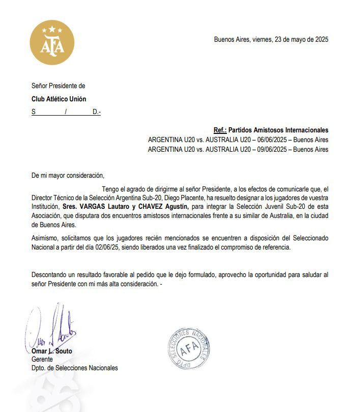 Los jugadores de Unión, Lautaro Vargas y Agustín Chávez fueron nuevamente convocados por Diego Placente para integrar la Selección Juvenil Argentina Sub-20.